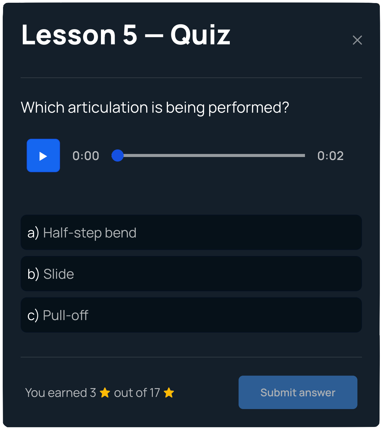 Fun exercises with a full-band backing track give you an immersive and musical learning experience. High quality tabs and backing tracks are provided for every exercise
